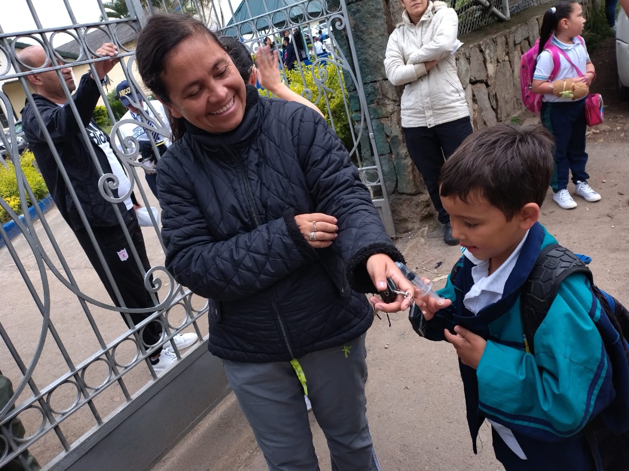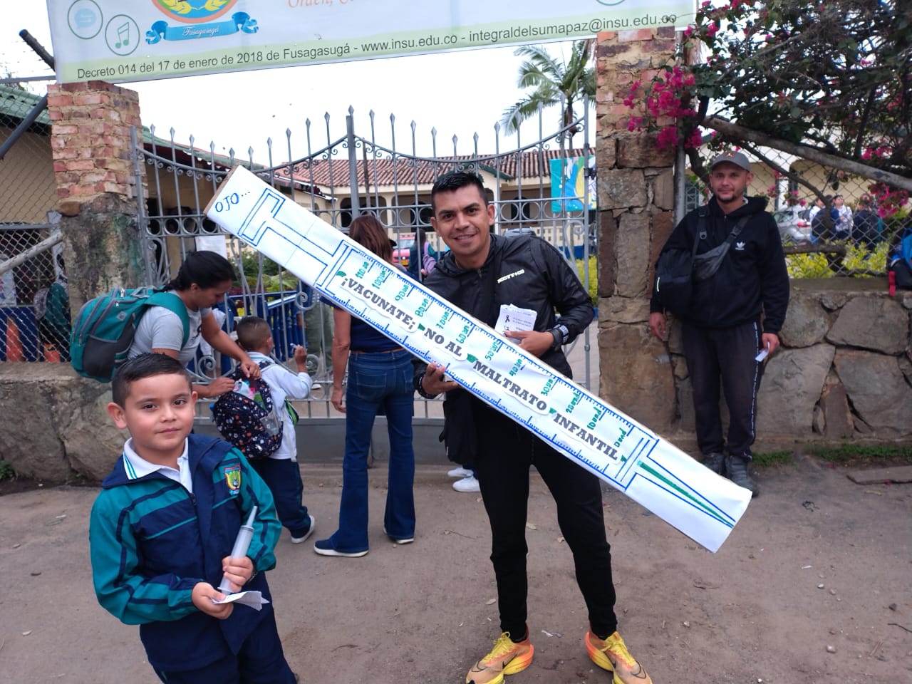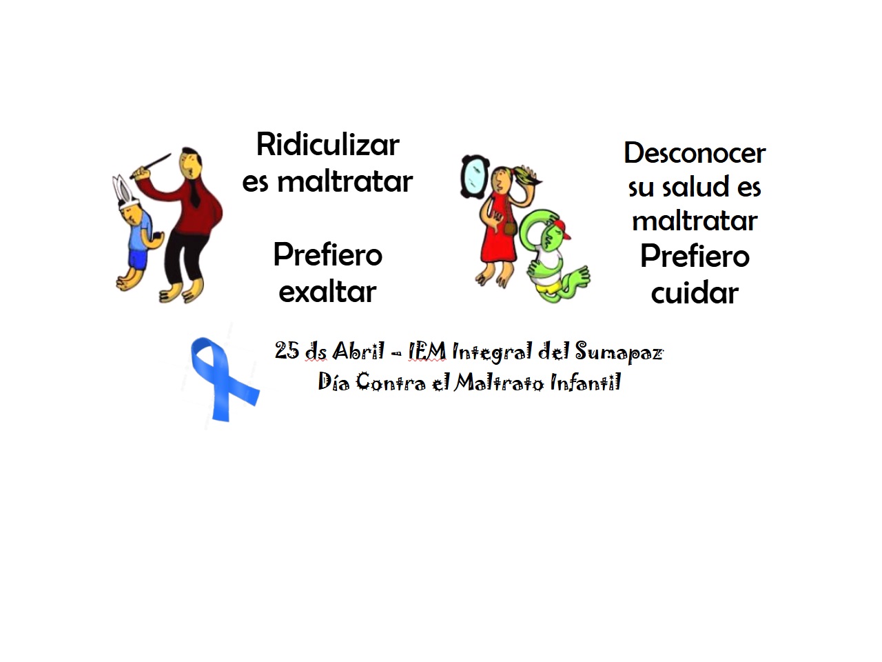 La IEM Integral del Sumapaz se une a la campaña contra el maltrato infantil, por unos niños, niñas y adolescentes sanos, integrales y felices. Hoy recibieron un listón azul, recibieron un mensaje y fueron vacunados contra el maltrato infantil los padres de familia que llegaron a dejar a sus hijos, los profesores, los funcionarios y los estudiantes de los grados superiores. |