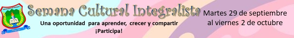 Entre el martes 29 de septiembre y el viernes 2 de octubre de 2020 realizaremos nuestra Semana Cultural Integralista que en esta ocasión se realizará en forma virtual a través del enlace https://meet.google.com/qer-issd-wxe. Tendremos muestras artísticas (danzas, canto, música), muestras tecnológicas y de emprendimiento, muestras científicas y nuestro English Day.