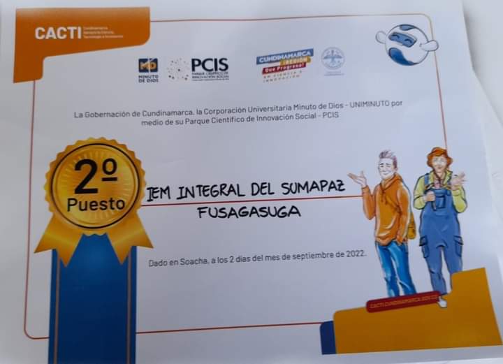 El equipo de niños de quinto de primaria de nuestra Institución que estaba representando a Fusagasugá en el Encuentro CACTI de la Gobernación de Cundinamarca y el Parque Científico de Innovación Social realizado en el municipio de Soacha, ocupó el segundo puesto e irá a representar a Cundinamarca en un certamen nacional que se realizará próximamente en Bogotá. Este triunfo se suma a otros reconocimientos y logros institucionales que no solo aumentan el sentimiento de identidad institucional, sino que fortalecen las habilidades, competencias y aprendizajes de los participantes. De ahí la importancia que tiene el apoyo que podamos dar desde la casa y el colegio a todas las iniciativas que de una u otra manera trascienden el aula de clases. Felicitaciones a nuestro equipo ganador.