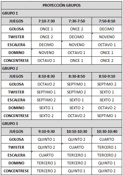 - El mismo 30 de julio y de manera paralela se realizará una serie de actividades con la Agencia Nacional de Seguridad Vial en el marco de la elaboración del proyecto de Seguridad Vial ordenado por la ley. Los grupos rotarán por las actividades y cada una de ellas tiene una duración de 20 minutos. Por tanto, no hay una coincidencia exacta con las horas de clase. El profesor con quien tengan clase hará el acompañamiento respectivo a los estudiantes. Si en medio de la actividad se acaba la hora, el profesor hará el empalme con el otro profesor para que continúe con el acompañamiento. Los horarios son: