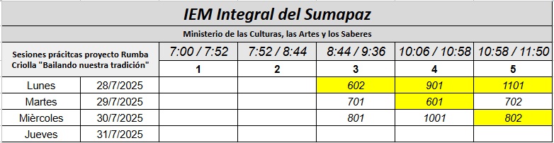 - Miércoles 30 de julio: Horario normal, aunque se realizarán tres actividades paralelas: Rumba Criolla, Educación en Seguridad Vial y prevención en uso de TIC.