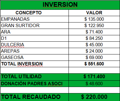 El pasado 28 de marzo la Asociación de Padres de Familia lideró un Jean Day para celebrar el día de la mujer y el día del hombre. El objetivo además de ofrecer un momento de esparcimiento a los estudiantes, era recoger fondos para la adecuación y pintura de la cancha deportiva que se encuentra deteriorada. Además, realizaron una cooperativa con la cual se buscaba recoger fondos que se convierten en un aporte para los uniformes de los equipos que representarán a la institución en los juegos intercolegiados. A continuación, algunas informaciones sobre la actividad y las respectivas cuentas entregadas. Muchas gracias a los padres de familia por su colaboración.
